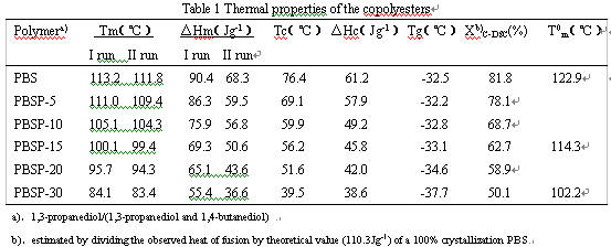 首先,采用熔融縮合聚合法合成了不同丙二醇含量的聚酯,然后用三氯甲烷溶解,甲醇沉淀。得到了白色纖維狀固體,室溫真空干燥。DSC測試的升降溫速率均為10℃/min,兩次循環測定,結果如下如表1所示:
