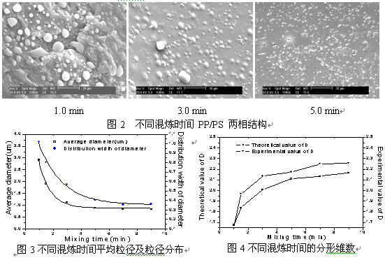 隨著混煉時間的增加,分散相顆粒的粒徑及其分布寬度逐漸減小,分散相的分布具有自相似性,分形維數逐漸增大并在混煉后期穩定下來,分形維數的實驗值與理論值具有一致的變化規律,說明分散相的破裂確有脆性破裂的特征。