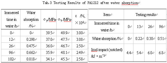 由Tab.3可以看到,PA1212拉伸試樣在吸水102h后的吸水率僅為0.818%,遠小于PA6和PA66。102h吸水后的拉伸屈服強度下降了不到14%;斷裂強度下降了9%。下降率遠遠小于PA6和PA66。缺口沖擊強度提高了55%。這些試驗結果說明PA1212的耐水性遠較PA6和PA66優越。