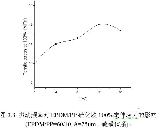 值得注意的是圖3.3,隨著振動頻率的增加,EPDM/PP硫化膠的100%定伸應力先增加后減小,當頻率在12Hz附近時,100%定伸應力達到其最大值。