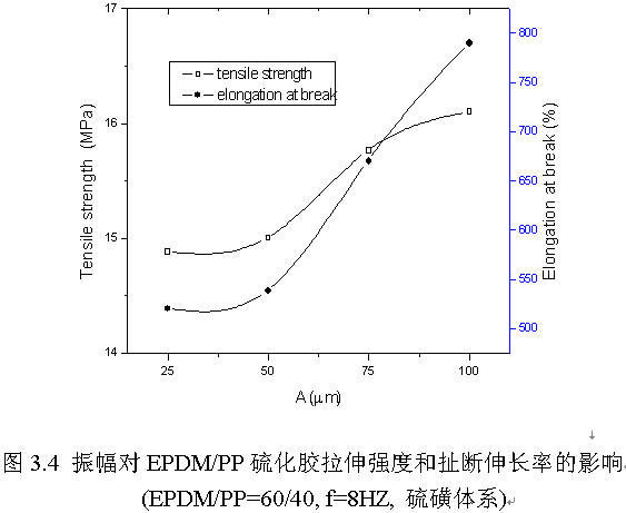 從圖3.4,圖3.5可以看出,隨著振幅增加,拉伸強度、扯斷伸長率、撕裂強度和邵爾A型硬度等一直保持增加的趨勢。