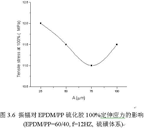 由圖3.6可以看出,100%定伸應力的變化趨勢跟預想的不同,不是隨振幅增加而增加,而是先減小而后增大,當振幅在75μm附近時,100%定伸應力達到最小值。