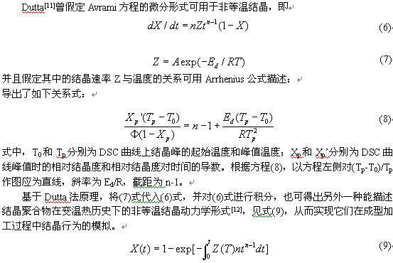 但是,由于在實驗中要實現等溫結晶,需選取合適的結晶溫度區間,這一溫度區間往往比聚合物在實際加工過程中出現結晶的溫度高,而不能準確反映出聚合物在加工過程中的結晶型為。因此有必要研究它們在變溫情況下的非等溫結晶動力學。目前,很多學者都是基于Avrami方程等溫結晶出發,同時考慮非等溫結晶的特點而修正得到的非等溫動力學方程。