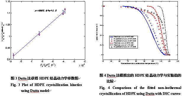 摘 要:通過差示掃描量熱法對高密度聚乙烯的非等溫結晶動力學進行了探討,引入非等溫結晶誘導時間后,比較了兩種能描述聚合物在變溫熱歷史下的結晶動力學,結果表明Nakamura法描述HDPE的結晶動力學與實驗一致性比Dutta法好。在Nakamura模型中,結合線性回歸分析和試差法,找到了能直接從非等溫結晶實驗中獲取HDPE的結晶動力學參數的方法。