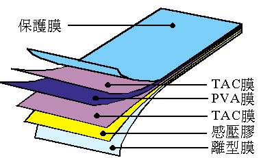 高分子膜在經過延伸之后,通常機械性質會降低,變得易碎裂。所以在偏光基體(PVA)延伸完后,要在兩側貼上三醋酸纖維(TAC)所組成的透明基板,一方面可做保護,一方面則可防止膜的回縮。此外,在基板外層可再加一層離型膜及保護膜,以方便與液晶槽貼合(如圖9)。