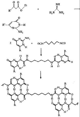 2-氨基嘧啶酮較容易獲得,它可由烷基酰基乙酸乙酯與胍合成,再與烷基二異氰酸酯反應(yīng)可生成2 -脲基-4 -嘧啶酮,其分子間由四重氫鍵形成線性超分子聚合物,如圖6 所示。