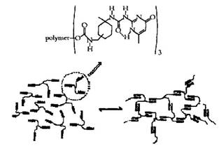 這種線性超分子聚合物的溶液粘性具有很大的溫度依賴性,當(dāng)溫度升高時(shí),使連接在兩個(gè)不同鏈上的脲基嘧啶酮之間的氫鍵強(qiáng)度先是變?nèi)踔敝磷詈髷嚅_,因此在較高溫度時(shí)材料表出現(xiàn)單體的性質(zhì),粘性降低,容易流動(dòng)與使用。
