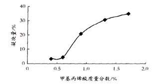 如圖 2 所示 , 隨著甲基丙烯酸用量的增加 , 乳液的穩定性有所下降 , 凝塊量增加。當甲基丙烯酸用量超過 0 . 6% 以后 , 乳液中的凝塊量急劇增加 , 穩定性迅速下降??赡苁怯捎谄渌苄源?, 易在水中自聚或者是加入量過大 , 超出了體系的 pH 值緩沖能力 ,pH 值降低 , 影響了體系的乳化效果而導致乳液穩定性下降。