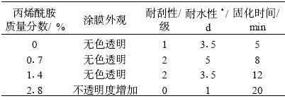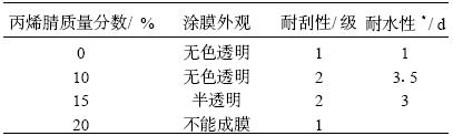 丙烯腈既是一種硬單體 , 又是一種功能性單體。在苯丙乳液中引入適量的丙烯腈單體參與共聚 , 能有效提高乳液的穩定性和耐水性 , 增加其對底材的附著力。但引入過多的丙烯腈 , 會造成涂膜硬度增大 , 不透明性增加 , 成膜性下降 , 耐水性變差 , 如表 2 所示。實驗中將丙烯腈的加入量確定為單體總量的 10 % ~ 15 % 。
