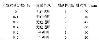表 4 苯酚用量對乳液性能的影響 注 : 3 涂膜在沸水中無變化的時間