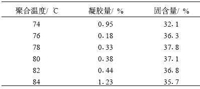 聚合反應的最低溫度必須保持在引發劑分解誘發溫度之上 , 以保證游離基的不斷供給及反應的連續進行 , 否則會發生 “ 停聚 ” 現象 , 導致整個聚合反應失敗。本實驗中 , 種子乳液的制備溫度控制在 76 ~ 80 ℃之間為佳。超過 80 ℃ , 制備出的乳液顆粒較大 , 分布不均勻 , 成膜性較差 ; 低于 76 ℃ , 則難以引發聚合反應。滴加混合單體時 , 反應溫度控制在 (80 ± 2) ℃。反應溫度低于該溫度 , 會導致反應速度減慢 ; 溫度過高 , 聚合反應速率增大 , 聚合物粒子變軟 , 粘性增加 , 使乳膠粒子間因碰撞而凝聚的可能性增加 , 不利于乳化體系的穩定。反應溫度對乳液性能的影響見表 5 。