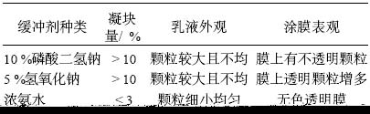 由表 6 可以看出 , 離子型緩沖劑磷酸二氫鈉溶液和氫氧化鈉溶液的緩沖效果不如共價型緩沖劑濃氨水的效果好 , 前兩者都會使乳液凝聚物增多。這可能是因為金屬離子帶電 , 影響了乳液的電荷平衡 , 導致乳液的穩定性下降 , 使乳液粒徑變大、凝塊量增加。