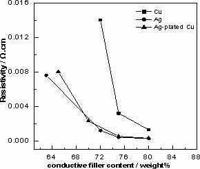 圖 2 為銅粉(平均粒徑 10 μ m ),片狀銀粉粒徑為 (0.1 - 10 μ m) ,和自制的鍍銀銅粉 ( 平均粒徑 10 μ m) ,與所選環(huán)氧樹脂和適當(dāng)比例的固化劑混合所制導(dǎo)電試樣電阻率與導(dǎo)電填料重量百分比的關(guān)系曲線。銀粉導(dǎo)電試樣當(dāng)銀粉含量為 63 %時,電阻率即可達(dá)到 10 - 3 Ω .cm 數(shù)量級,當(dāng)銀粉含量為 75 %時,電阻率即可降到 4 × 10 - 4 Ω .cm ;而銅粉導(dǎo)電試樣當(dāng)銅粉含量達(dá)到 75 %,體積電阻率方可降到 10 - 3 Ω .cm ,當(dāng)銅粉含量達(dá)到 80 %,電阻率亦很難降到 10 - 4 Ω .cm ;本實(shí)驗(yàn)室自制的鍍銀銅粉顯示了良好的導(dǎo)電性,當(dāng)所鍍銀含量為 23 %時,其導(dǎo)電性與銀粉導(dǎo)電膠基本一致,含 75 %的鍍銀銅粉導(dǎo)電試樣電阻率為 5 × 10 - 4 Ω .cm 。導(dǎo)電顆粒互相接觸形成導(dǎo)電通道網(wǎng)絡(luò),是導(dǎo)電復(fù)合材料導(dǎo)電的前提 [6] , 銀在空氣中的穩(wěn)定性及 Ag 2 O 的高導(dǎo)電率,決定了較少銀含量就可形成導(dǎo)電網(wǎng)絡(luò);銅粉在空氣中很容易被氧化,粒徑愈小氧化愈快,而且固化過程也會帶來部分銅粉表面氧化,因此相同比例的銅粉導(dǎo)電試樣電阻率較高。鍍銀銅粉中銀顆粒均勻的包覆在銅表面,當(dāng)形成導(dǎo)電通路時,基本以銀形成導(dǎo)電通道網(wǎng)絡(luò) , 因此鍍銀銅粉表現(xiàn)出良好的導(dǎo)電性。