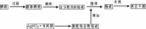 經(jīng)過反復(fù)實(shí)驗(yàn),選擇分散劑和絡(luò)合劑的品種及濃度得到一種不含氰化物的化學(xué)鍍銀工藝, 采用此法制備的鍍銀銅粉,導(dǎo)電率高 ,銀的反應(yīng)率可達(dá) 90 %以上。因此 通過調(diào)整銀胺絡(luò)合溶液中銀相對于銅粉的比例,即可得到所需含銀量的鍍銀銅粉。該方法的工藝流程示意圖如下: