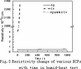表 1 和圖 3 為銅粉、片狀銀粉及鍍銀銅粉導(dǎo)電試樣在 60 ℃ 相對濕度 100 %條件下進(jìn)行濕熱實(shí)驗(yàn)時電阻率隨時間的變化。銅粉導(dǎo)電試樣 24 小時電阻升高近 5 倍,三天已完全不導(dǎo)電,銀粉導(dǎo)電試樣在 24 小時內(nèi)電阻有所下降,然后基本保持不變。鍍銀銅粉中銀起到導(dǎo)電通路的作用,因此可達(dá)到基本與銀相同的導(dǎo)電穩(wěn)定性。