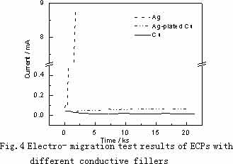 表 2 和圖 4 是直流偏壓為 5V 時,不同導(dǎo)電試樣電遷移試驗(yàn)時電流隨 時間的變化曲線,銀導(dǎo)電試樣在約 200 秒時電流開始快速增大 , 約 700 秒內(nèi)已增至 mA 級電流,在濾紙條上可清晰的觀察到黑色的枝狀沉淀物 , 兩電極已經(jīng)連通 , 表明已經(jīng)短路 ; 而銅導(dǎo)電試樣電極經(jīng) 20000 秒的試驗(yàn) , 電流穩(wěn)定在 15-30 μ A 之間 , 并未短路,濾紙上可見一條藍(lán)色細(xì)線 , 表明銅也發(fā)生溶解 , 形成銅離子 , 但未形成枝晶狀沉淀 ; 鍍銀銅粉導(dǎo)電試樣電極同樣經(jīng) 20000 秒試驗(yàn) , 電流穩(wěn)定 , 沒有短路,在濾紙上可見一條藍(lán)色細(xì)線 , 在陰極附近有少量褐色物質(zhì)。