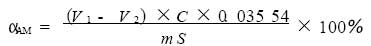 式中 Α AM 為丙烯酰胺含量 , ? Α ; V 1 為空白實驗所消耗的硫代硫酸鈉標準溶液的體積 , mL; V 2 為試樣所消耗的硫代硫酸鈉標準溶液的體積 , mL; C 為硫代硫酸鈉標準溶液的濃度 , mo l / L; 0.035 54 為與 1. 00mL 硫代硫酸鈉標準溶液 ([N a 2 S 2 O 3 ]= 1. 00mo l / L) 相當的丙烯酰胺的質量 , g; m 為試樣質量 , g; S 為試樣固含量 ,.