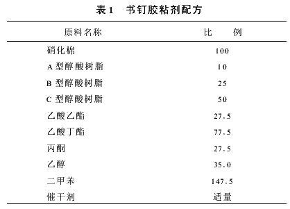 由于制釘工藝中需要膠粘劑能快速干燥,因此對溶劑的要求就比較苛刻,既要考慮溶劑的溶解性能,又要考慮其揮發(fā)性能。選用低沸點的乙酸乙酯、丙酮及中沸點的乙酸丁酯配合作為溶劑,采用低沸點的乙醇作為助溶劑,采用中沸點的二甲苯作為稀釋劑,通過不斷的試驗并檢測其性能,確定最佳配比如下:乙酸乙酯15 5%、丙酮5 5%、乙酸丁酯5 5%、乙醇7%、二甲苯29%。書釘膠粘劑的配方見表1。
