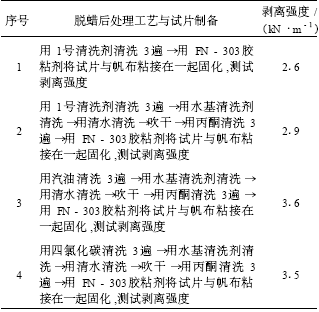 為了考查脫漆之后的脫蠟后處理工藝對零件與帆布之間粘附強度的影響 , 采用 FN - 303 膠粘劑將脫漆、脫蠟后處理后的試片與帆布粘接在一起固化 , 測試其剝離強度。結(jié)果列表 2, 其中水基清洗劑濃度為 3% ( 質(zhì)量分?jǐn)?shù) ) 。