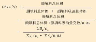 單純的 PVC 值對涂料的影響并不直觀,因此又引入了臨界顏料體積濃度( CPVC )的概念,它指的是在 PVC 值增加過程中,當漆基樹脂恰好能潤濕所有顏料粒子時的 PVC 值,所代表的漆基樹脂是指臨界狀態下的樹脂含量。通過 PVC 和 CPVC 的比值能更直觀地推算出涂料的性能。臨界顏料體積濃度( CPVC )可以使用如下公式計算: