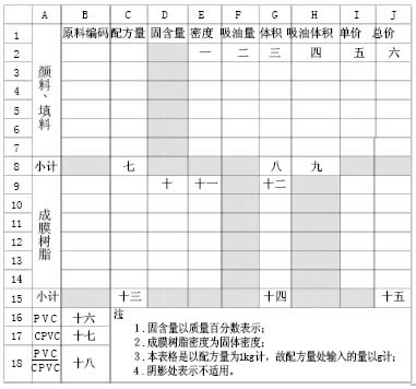 位于 PVC 工作簿中工作表 sheet1 ,以某一配方含有 7 種顏、填料及 6 種成膜物為例,建立如下頁所示工作區: