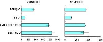 Introduction: Silks have many inherent superior properties as biomaterials in the viewpoints of mechanical properties, environmental stability and biocompatibility. In this research, silk-like materials were designed and produced with genetically engineering synthesis method, which were generally combined with the structural units selected from Bombyx mori silk fibroin and animal elastin, and the functional units, e.g., RGD sequence, derived from fibronectin in order to improve the cell adhesion property.