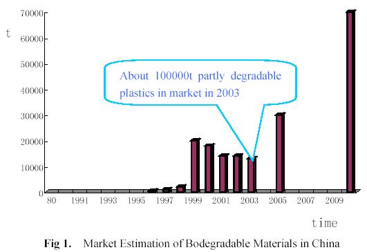 It began to research degradable plastic from 1980’ in China. At that time, the products is mainly concentrated on photo-degradable and partly biodegradable (starch-filled) polymer. The completely biodegradable materials began to research at middle of 1980’ ,but it is not developed quickly until in 1996. The situation of biodegradable plastic is shown on fig.1 and the consist of biodegradable materials in 2003 is described on fig.2