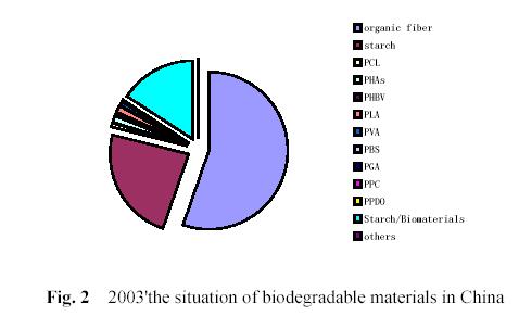 The fig.2 shows the distribution of biodegradable materials in China in 2003. we can see from fig.2, in 2003’ market of biodegradable materials the main materials are organic fiber of crop and starch while the amount of biodegradable plastics is little which is about 3000 t. In present market, it’s mainly PLA,PCL, PHBV, PHAX, PVA(film), PPC, starch plastics.And now starch plastics, PPC have being produced in some factories with pilot scale and applied in some fields while PHB, PBS, PGA, PPDO, PLGA, bio-PUR, etc. have being studied in laboratory-scale.