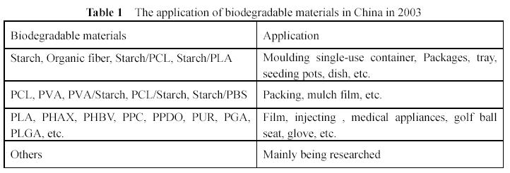 The main application of biodegradable materials in China in 2003 are listed on table 1. As shown on table 1, starch and organic fiber are mainly made to single-use lunch container. PVA, PVA/Starch, PCL are mainly made to packing film or mulch film. PHBV, PLA, PHAX, etc. are made to film or injecting or medical appliances.