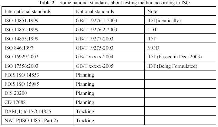 Now in China, there are some standards about products have or being formulated which are specified the biodegradability of materials which are listed on table 3.