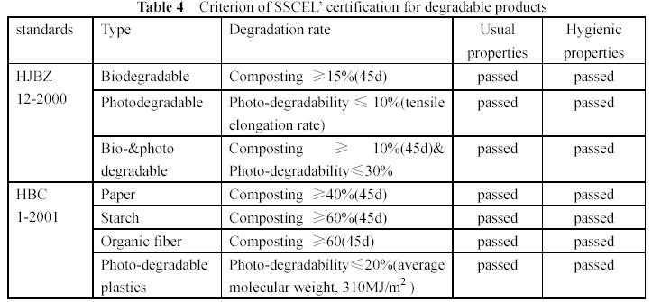 The SSCEL has been set up by State Environmental Protection Administration and certificated the degradable packing film with HJBZ 12-2000 and the degradable single-use lunch container with HBC 1-2001. If the sample passes the testing including degradability and other properties, the SSCEL will certificate and label the products with market as fig3. The table4 shows the criterion of SCCEL’s certification for degradable products.