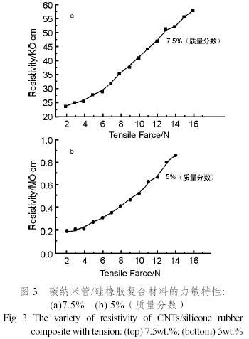 圖3顯示了碳納米管含量為5%(質量分數)和7.5%(質量分數)的碳納米管/硅橡膠復合材料的力敏特性。當材料受外力而產生彈性形變后,其電阻率將發生變化,這種效應稱為壓阻效應。從圖3中可以看出,拉力較小(<5N)時,復合材料的體積電阻率隨拉力增加變化較小,當拉力繼續增大時,電阻率與拉力近似成線性關系,壓阻效應較為顯著。這是由于在碳納米管/硅橡膠復合材料中,碳納米管聚集成網狀結構,外力引起的形變在微觀上表現為橡膠高分子鏈段的相對滑移、扭轉以及折疊等運動,,這一方面使得部分碳納米管構成的導電連續通道被破壞,導電網絡減少;另一方面增加了碳納米管之間的距離,使得隧道導電效應減弱,因此電阻率隨拉力的增大而增大。