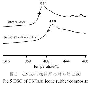 圖5為添加5%(質量分數)CNTs的硅橡膠及空白硅橡膠試樣的DTA曲線。從圖5中可以看出:沒有添加碳納米管的硅橡膠在372.4℃開始分解,而添加5%(質量分數)CNTs的硅橡膠在404.6℃分解,其分解溫度比空白樣提高了32℃。復合材料耐熱性提高的主要是由于以下幾個方面的原因:首先,填料的加入使殘存催化劑(有機錫)的濃度降低[14];其次,硅氧烷主鏈降解時的活性末端觸碰到碳納米管以及其碳納米管末端的氧化物催化劑顆粒時會失去活性,不再引發主鏈剩余部分的降解[15],而且由于碳納米管的比表面積大,其表面和斷口存在大量的官能團,硅橡膠大分子鏈可能直接與這些官能團相連,這種相連使很多的硅橡膠大分子鏈連接在一起而使復合物的交聯點增加,較高的交聯密度會抑制硅氧烷主鏈的降解,所以提高了CNTs/硅橡膠耐熱性能。