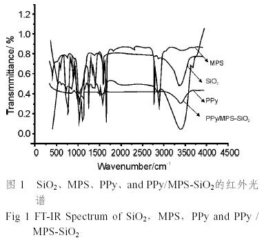 SiO2、MPS、PPy和PPy/ MPS-SiO2的IR譜圖參見圖1。由圖可知,SiO2的特征吸收峰(1100cm-1)、硅烷偶聯(lián)劑MPS的特征吸收峰(2946、2846、1720、1638、1455、1167、1088 cm-1)和PPy的特征吸收峰(1540、1460、1300、1150 和890 cm-1)在PPy/ MPS-SiO2的IR譜圖中都有體現(xiàn)。盡管官能團的分子環(huán)境差異使峰位有所偏離,但足以證明復合體系中的PPy、SiO2和MPS的存在。