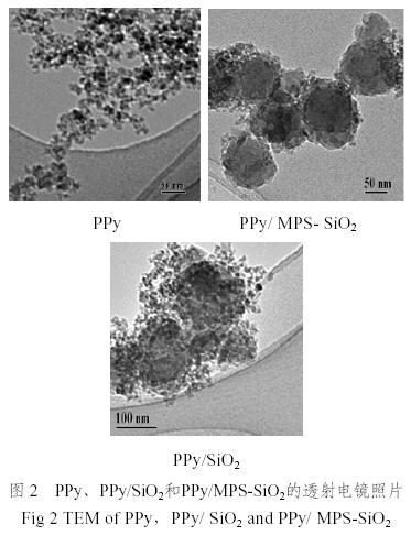 圖2 分別為PPy、PPy/ SiO2、PPy/ MPS-SiO2的TEM照片。由圖可見,用偶聯(lián)劑MPS處理SiO2粒子,隨后進行吡咯的聚合,得到的粒子外表為富含聚吡咯的PPy/ SiO2復合材料,外型似“木莓形貌”(raspberrymorphology),此種形貌曾被Armes、Gill[3,4]等小組報道過。與未用偶聯(lián)劑處理的SiO2制備的PPy/ SiO2復合材料相比,PPy/ MPS-SiO2復合材料中SiO2粒子表面被PPy包覆的更完全。這是由于未處理SiO2時,吡咯基本是在SiO2孔隙中聚合,所得的材料表面富有SiO2;而經(jīng)MPS處理后,MPS發(fā)生醇解生成硅醇基,與SiO2表面的羥基發(fā)生化學鍵合將SiO2包覆,而MPS的羰基與吡咯環(huán)上的仲胺基可形成氫鍵使得材料表面富有PPy,因此表現(xiàn)出較高的電導率。