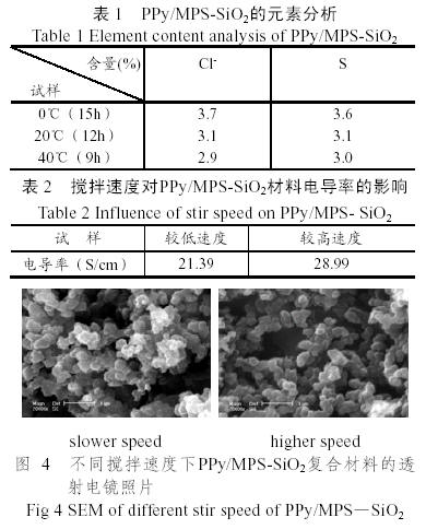 圖3 為不同反應溫度和時間與PPy/MPS-SiO2復合材料電導率的關系曲線。由圖可看出,溫度越低反應速度越慢,聚合時體系顏色變化比較緩慢,材料電導率呈現(xiàn)上升的趨勢;電導率隨反應時間呈先上升后下降的趨勢。原因可能是吡咯聚合系逐步聚合,低溫下聚合反應速度低反應時間較長,能進行較好的聚合和摻雜,形成的聚合物鏈缺陷少,鏈段長,結構規(guī)整度好,所以電導率較高。但反應時間過長,可能會有一些副反應發(fā)生及吡咯環(huán)局部過氧化,導致電導率下降[5]。據(jù)此我們作了0℃(15h)、20℃(12h)、40℃(9h)材料的元素分析,結果如表1。