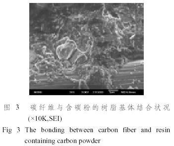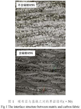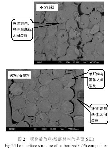 由圖1可見,不含碳粉體系的碳/酚醛材料中基體樹脂內部氣孔很多,且大小不一,有的氣孔穿透酚醛樹脂基體層,到達碳布層的表面。所有這些缺陷將導致復合材料的層間性能的下降。而含碳粉體系內基體部分致密,微米尺度氣孔明顯少,樹脂基體與碳布層結合緊密。