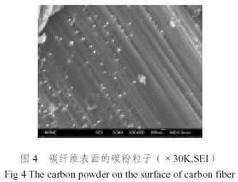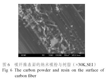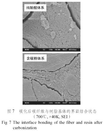 在2000倍下,纖維與纖維之間存在大量的含碳粉的樹脂基體,基體與碳纖維結合良好;在10000倍下(圖3),碳纖維表面存有大量的納米碳粉(含樹脂)的顆粒。圖4為碳化后的單根碳纖維表面狀態,由圖4可知,樹脂基體脫落后,碳纖維表面殘存了大量的納米碳粉粒子。圖5為700℃碳化后纖維與樹脂基體的結合狀態,可見樹脂基體與碳纖維之間間隙非常小。進一步對碳化后材料中碳纖維表面進行分析,結果見圖6,從圖6可發現,大量不同粒徑的納米碳粉粒子與樹脂基體滲入碳纖維表面的溝槽中,增大了碳纖維表面積,提高表面活性,同時可看出纖維表面存在明顯的樹脂剪切拉伸斷裂帶。圖7為700℃碳化纖維與基體的界面結合狀態,從圖7 可看出,不含碳粉體系的纖維與樹脂之間在碳化后的界面間隙一般達到200nm以上,而含碳粉體系纖維與樹脂之間在碳化后的界面間隙一般比較低,在100nm以下,同時由于碳化中界面的作用力,碳纖維出現開裂情況,纖維與樹脂的斷裂面出現不規則的形狀,樹脂突起部分與纖維表面的溝槽相一致,形成了鑲嵌結構,而純樹脂體系的界面斷裂面光滑。這一結果表明,納米碳粉對碳纖維有很好的親和性,纖維與基體的界面所存在的大量納米粉體粒子對材料層間性能與纖維方向壓縮強度的提高能起到有利的作用。