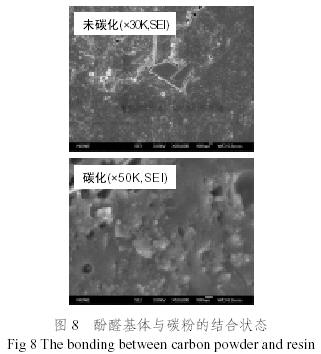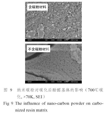 對納米碳粉與酚醛樹脂之間結合狀態進行了分析,圖8為酚醛樹脂基體與碳粉的結合狀態;圖9為碳粉對碳化后酚醛樹脂基體的影響。由圖8可發現,納米碳粉與樹脂基體結合緊密;由圖9可知,含碳粉材料碳化后內部氣孔相對較大且較多,形成了大量的納米級的球形空洞,納米碳粉粒子約束了樹脂基體的碳化收縮,樹脂基體開裂情況比較少。而不含碳粉體系的基體內部也有碳化后的氣孔,但是數量比較少,同時可看出氣孔呈現不規則的扁孔形狀,這可能是樹脂碳化收縮產生應力而變形所致。