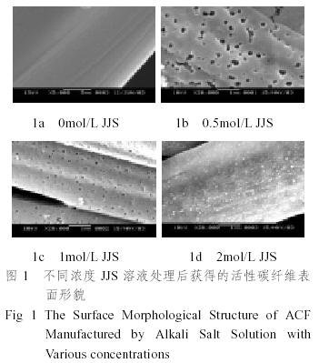 從圖1可以看出,不經(jīng)堿金屬鹽溶液處理的粘膠原絲(圖1a),即便采用化學(xué)和氣體相結(jié)合的活化方法,也和以往常規(guī)方法獲得的活性碳纖維一樣,表面光滑,在現(xiàn)有的測試條件下(放大2萬倍)并不能觀測到孔洞。但這并不代表其表面沒有微孔,微孔的孔徑及其分布可以用等溫吸附曲線、BET法或t圖法等方法來表征。我們將在以后的研究中進(jìn)行具體計(jì)算和分析。
