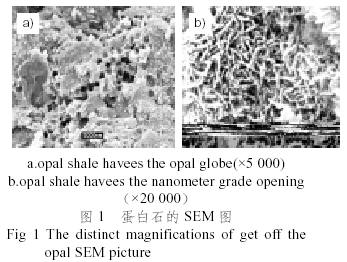 為了研究蛋白石的微觀結(jié)構(gòu),我們進(jìn)行了掃描電鏡下的觀察(見圖1)。首先鱗石英都呈細(xì)小鱗片狀集合體,并組成一個(gè)絨球體,在這些球體的外邊往往套著一圈方英石,在一些單獨(dú)的蛋白石球周邊也包著一個(gè)方英石殼,它的大小在電鏡下測得為0.1~0.3μm。通過以上觀察可得這樣的結(jié)論,蛋白石的吸水性是由于大量的毛孔狀微孔隙所致;硬度低是由于組成巖石的單個(gè)礦物晶體很小,而結(jié)合又很不牢固,并存有大量微孔隙。蛋白石內(nèi)部結(jié)構(gòu)具有20~60nm和0.1~0.4μm級孔,可以吸附有毒、有害氣體和元素。這一重要的發(fā)現(xiàn)與研究使蛋白石的研究具有了突破性的進(jìn)展,使蛋白石這種微米級粒徑、納米級孔材料的研究進(jìn)入了21世紀(jì)時(shí)代的前沿陣地。