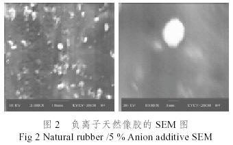如圖2、圖3用掃描電鏡觀察負(fù)離子天然橡膠和負(fù)離子丁苯橡膠斷面的表面形貌,可以看到,負(fù)離子添加劑的平均粒徑約為3μm,共混分散性較好,無團(tuán)聚現(xiàn)象。負(fù)離子添加劑的粒子不能完全被基體包埋,這種混合方式更方便極化空氣中的水分,有利于負(fù)離子的釋放,提高負(fù)離子添加劑的有效利用,包埋的負(fù)離子添加劑據(jù)釋放機(jī)理被部分削弱。