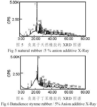 由X射線衍射分析,如圖4~6,負(fù)離子添加劑中的蛋白石在2θ=5.44°處出現(xiàn)層狀結(jié)構(gòu)001面的特征衍射峰,通過Bragg方程可以計(jì)算出蛋白石復(fù)合材料中片層間距或孔距為1.62nm, 然而在天然橡膠/5%負(fù)離子添加劑在2θ=9.4°處有一微弱的峰,片層間距減小到d=0.94nm;在丁苯橡膠/5%負(fù)離子添加劑共混物中的衍射峰看到,2θ<10°處的峰消失。說明蛋白石粒子在橡膠基體中已經(jīng)被剝離、分散。