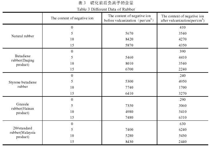負(fù)離子添加劑應(yīng)用在橡膠中,使橡膠釋放負(fù)離子,利于人體健康。測定負(fù)離子數(shù)數(shù)據(jù)如表3。