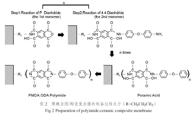 Okazaki和Sawamoto等人用(C2H5O)3Si- CH2CH2CH2NH2(3-氨基丙基三乙氧基硅烷)對多孔陶瓷膜進行表面修飾,使無機膜表面帶有-NH[33, 34]2。Okazak采用的是液相納米技術接枝過程,酸酐和二胺的溶液分別與修飾的陶瓷膜接觸,生成表層有聚酰亞胺(PI)復合膜。酸酐和二胺在-NH2修飾的陶瓷膜上重復反應的過程如圖2。重復反應次數不同,PI /陶瓷復合膜對CO2/CH4的分離系數的變化范圍為1.0~6.4,分子截留范圍為400~4000。采用液相納米技術接枝過程,每步反應之后的殘余單體沒有清洗干凈,這些單體在以后的反應中又參與了反應,致使膜孔被堵。鑒于殘余單體難于清洗,Sawamoto改用氣相納米接枝過程,反應原料和步驟類似,但各反應物都是以氣態形式與陶瓷膜接觸,得到的PI /陶瓷復合膜對CO2/CH4的分離系數的變化范圍為0.87~16[34]。