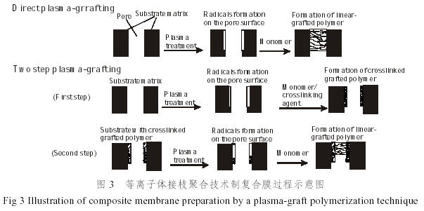 等離子體聚合是一種較新的聚合方法,無機多孔膜等離子體處理后,一定條件下再與聚合單體接觸,單體就會在其表面和孔壁上接枝聚合,生成線性聚合物,聚合反應可以通過在反應管中引入空氣終止,最終可得到接枝程度不同的復合膜[40],復合膜中聚合物層與無機膜層之間結合得非常緊密。如Kai等人[41]以多孔玻璃膜為基體,丙烯酸甲酯(MA)為單體,采取直接等離子接枝和兩步等離子接枝的方法制備復合膜(圖3)。前一種方法單體直接在等離子體處理過的玻璃膜孔壁上接枝聚合,所形成的層厚約50μm;后一種方法分兩步,第一步以單體和交聯劑的混合物為原料,在多孔玻璃膜孔表面接枝聚合一簿層交聯聚合物,第二步是在這一層交聯聚合物上,單體聚合形成線形接枝聚合物,這種方法得到的接枝層厚為25~30μm。這兩種方法制備的聚丙烯酸甲酯/多孔玻璃復合膜在氯仿/環己烷混合物的全蒸發和蒸汽滲透實驗中對氯仿有很高的選擇性,28%的環己烷的氯仿溶液的滲透率達到0.5kg/m2 h,對氯仿的分離因子高達16.3。