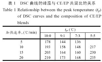 用PE公司的Pyris-1型熱分析儀測定共混物的示差掃描量熱(DSC)曲線。測定條件如下:升溫速率分別為5℃/min、10℃/min、15℃/min和20℃/min,溫度范圍是25~280℃。
