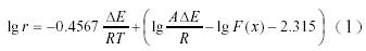 式中F(x)是與轉化率有關的函數,∆E是自由能,R是氣體常數,A是常數。在相同的轉化率下,以lgr 對(1/Tp)(Tp=273.15+ tp)作圖可得一直線(圖1),斜率為k = −0.4567∆E/R,所以表觀活化能∆E為−kR/0.4567,計算結果見表2。