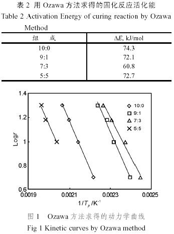 固化反應的活化能反映了固化反應的難易程度。從表1和2可以看出,氰酸酯樹脂與環氧樹脂的比例對其固化行為有很大的影響。適當地選取兩者的配比,將能大大的降低固化所需要的溫度。