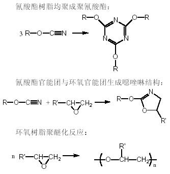 固化反應的動力學可以根據樹脂的反應性基團的含量隨時間、溫度和固化處理的條件的變化而得到。氰酸酯樹脂/環氧樹脂共混體系在固化過程中的反應非常復雜,對此人們已經作了廣泛而深入的研究,一般認為有以下幾種主要反應: